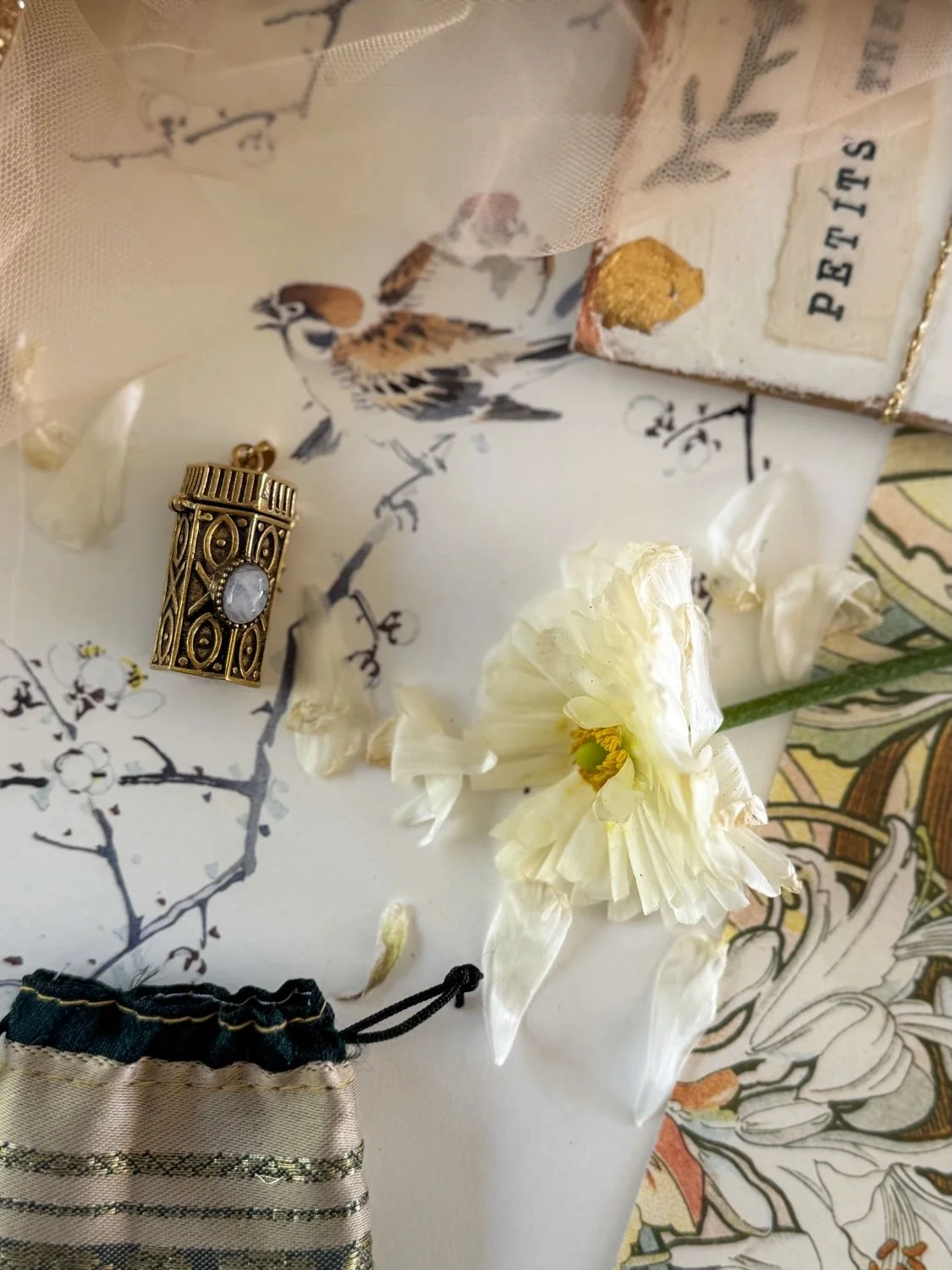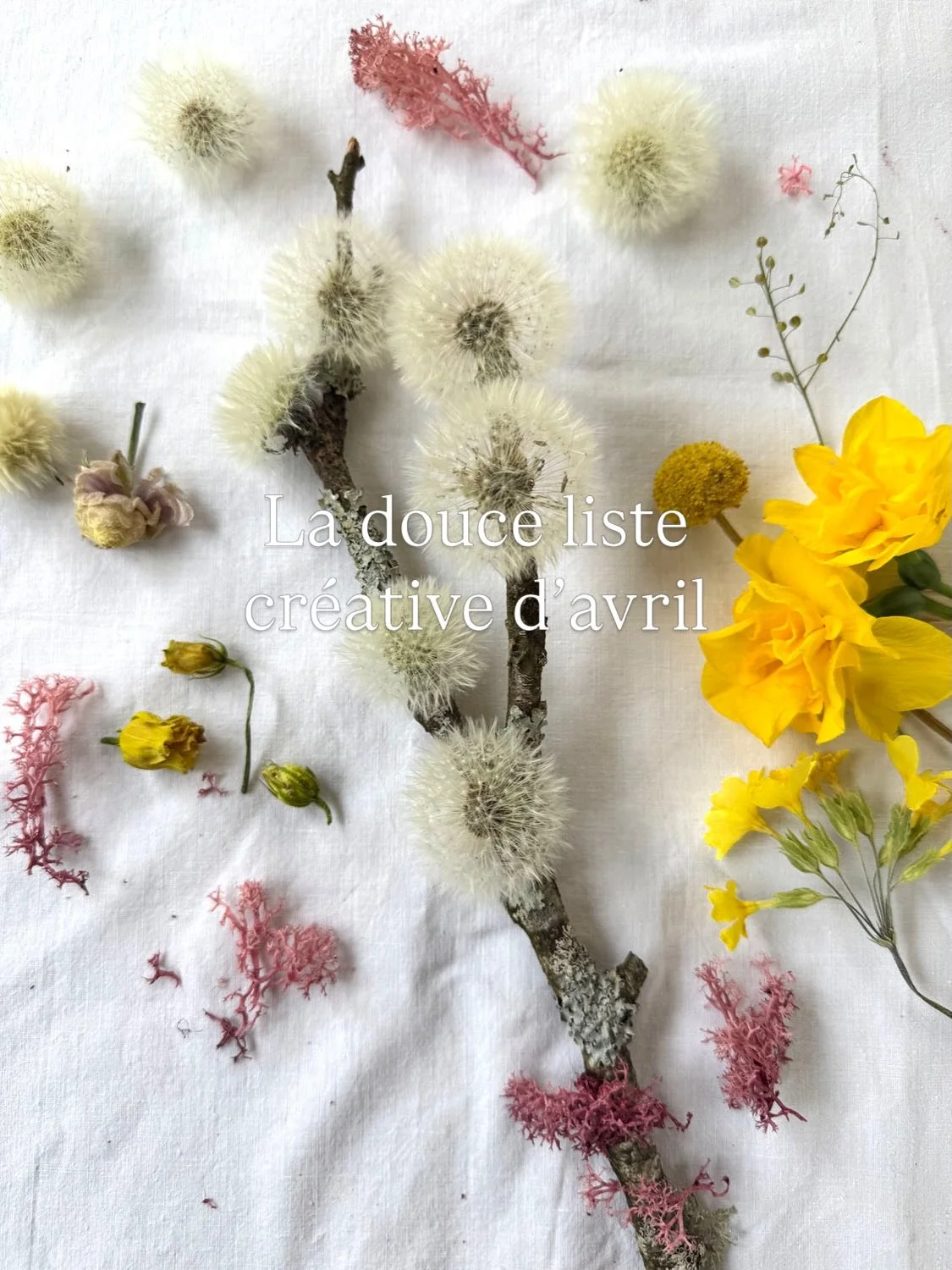 Avril s’installe entre averses et éclaircies, dans un équilibre délicat entre l’hiver qui se retire et le printemps qui s’affirme. Les jardins en sommeil se réveillent, les fleurs s’ouvrent sans retenue, les corsages se font plus légers. C’est un mois vivant. On passe davantage de temps dehors, on chine dans les brocantes de jolies étoffes, des dentelles, des napperons désuets. On compose des bouquets, et on garde quelques spécimens pour les faire sécher.