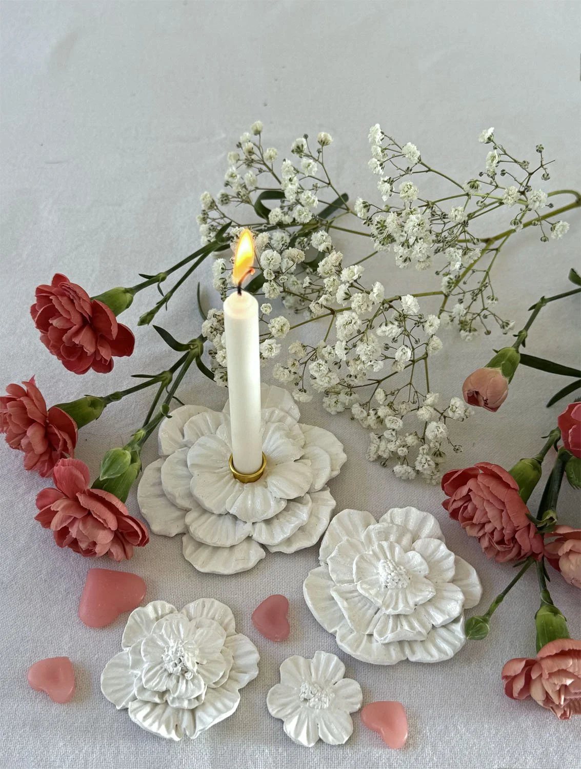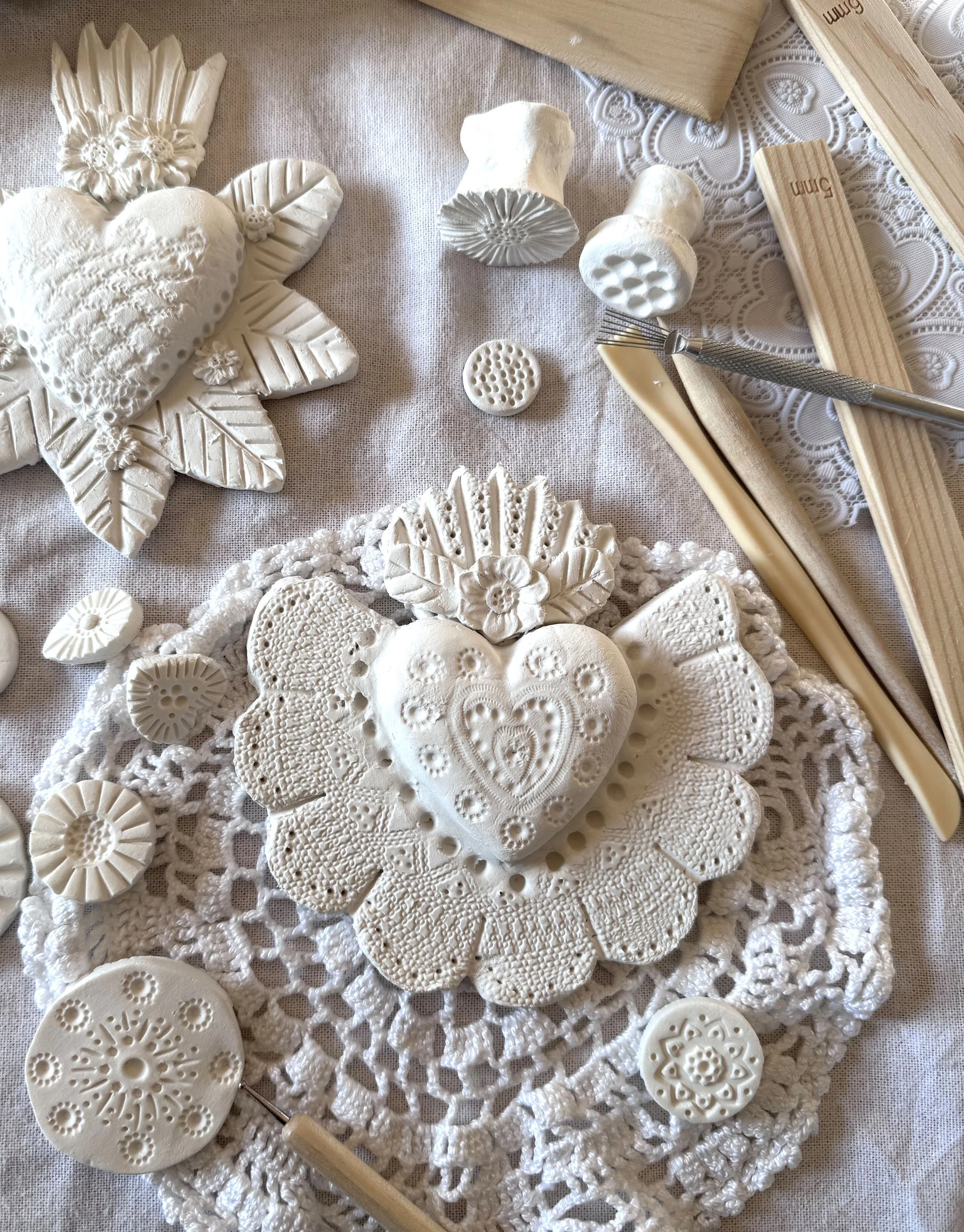 Plusieurs formats d’ateliers sont possibles selon vos envies : du modelage libre à des propositions plus guidées, autour de pièces décoratives comme les cœurs ex-voto, ou encore l’exploration des finitions (dorure, résine…).
