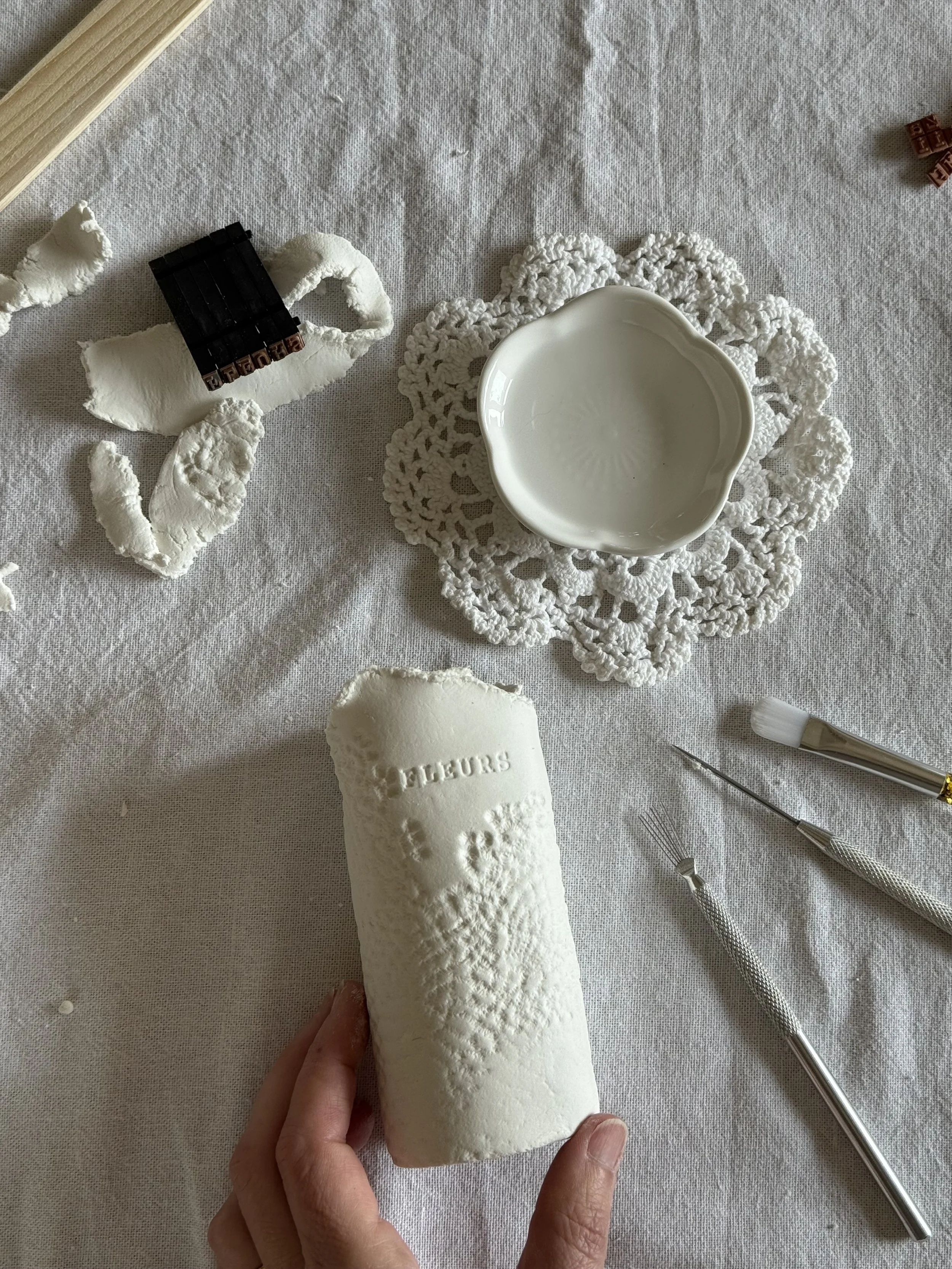 Nous explorons ensemble différentes approches du modelage, comme l’estampage ou le travail à la plaque, ainsi que le jeu des empreintes et des textures.