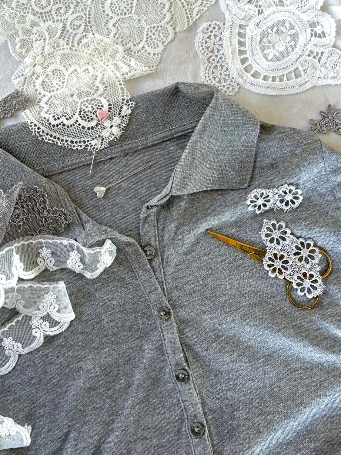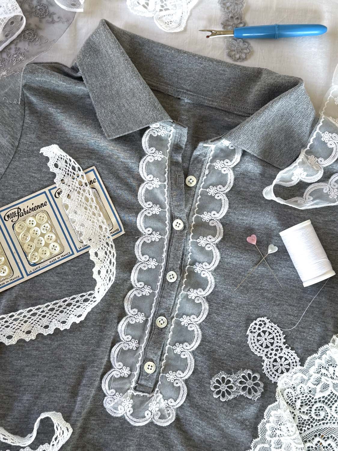 Reprendre un polo taché avec de la dentelle et des boutons de nacre