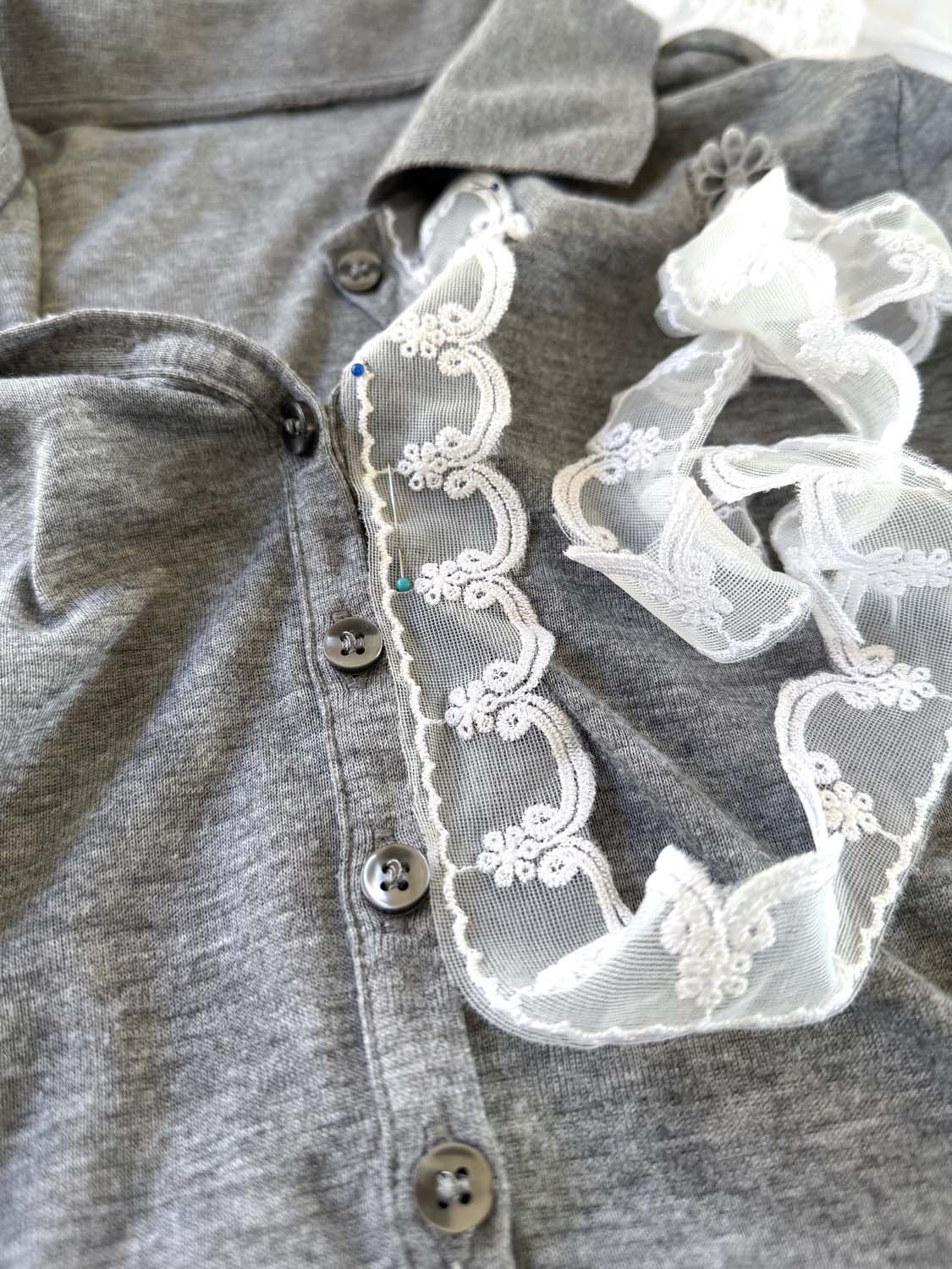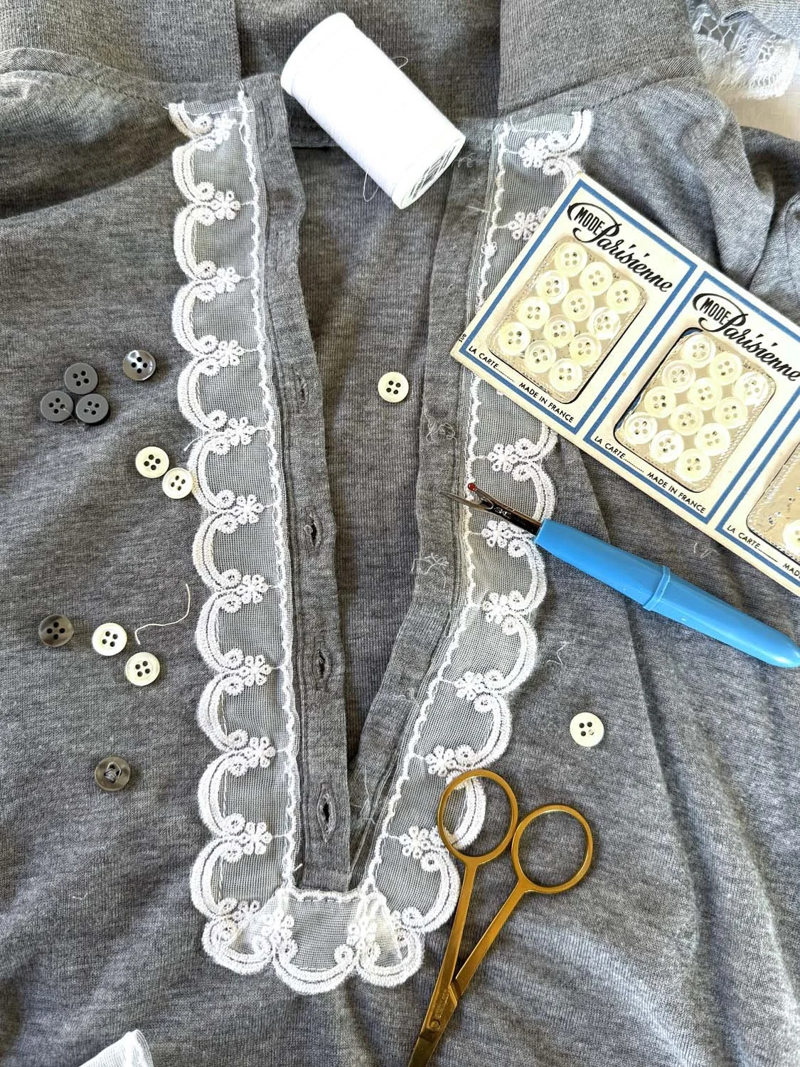 Ce polo gris en coton stretch faisait partie des retoqués. Une tache, juste au bord de la patte de boutonnage, sous le sein. Plutôt que de l’abandonner, j’ai choisi de le réinventer avec une bande de dentelle et quelques boutons de nacre. Une transformation simple et accessible et qui redonne au vêtement une seconde vie.