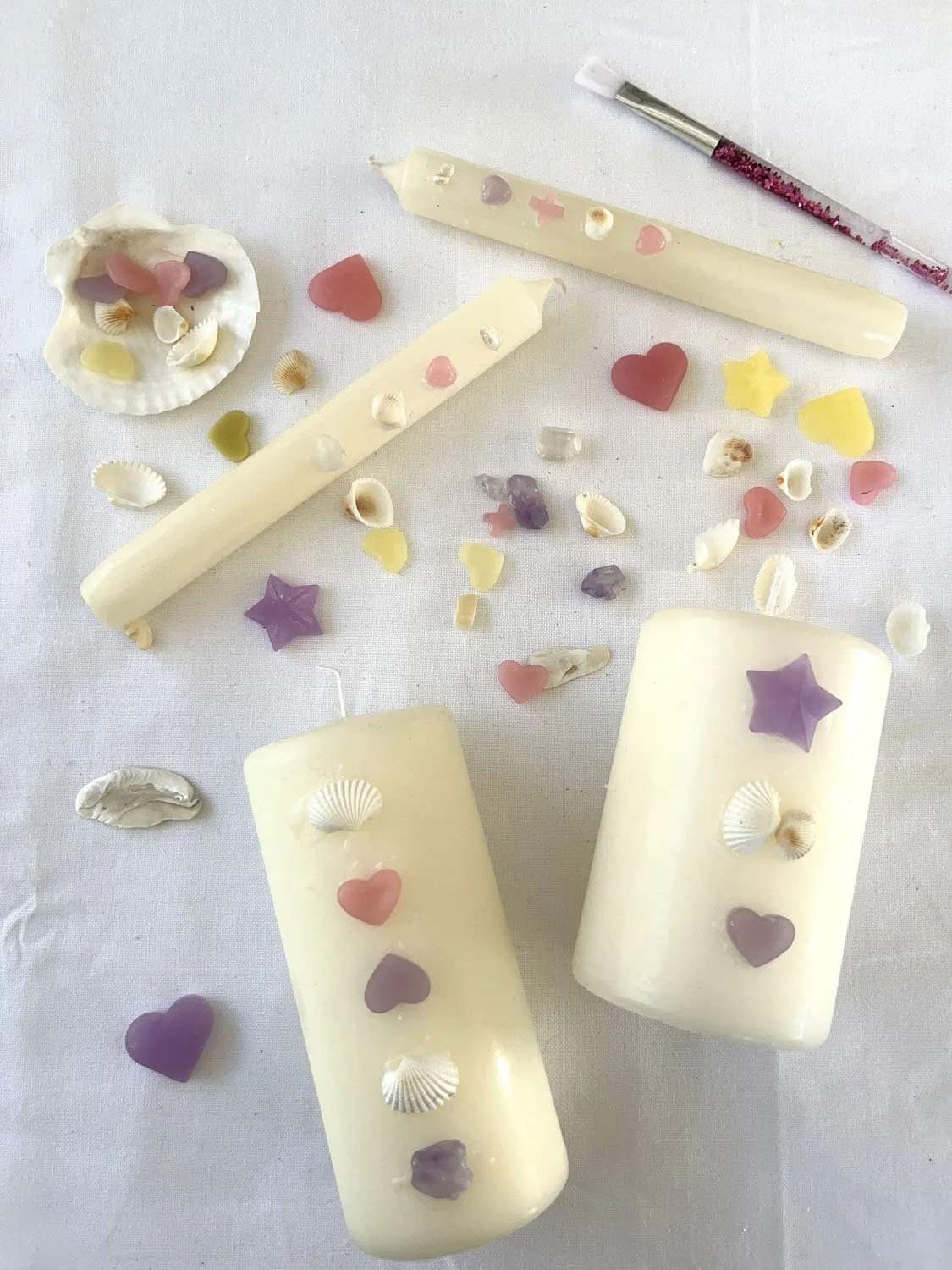 4- Positionnez des coquillages, des pierres et des éléments en cire sur vos bougies, sur leur longueur. Creusez un peu avec la pointe d’un couteau à l’emplacement qui va accueillir le premier élément. Collez-le en le badigeonnant de cire fondue avec un pinceau. Maintenez l’élément collé sur la bougie une vingtaine de secondes, le temps qu’elle sèche un peu. Recommencez pour chaque élément.