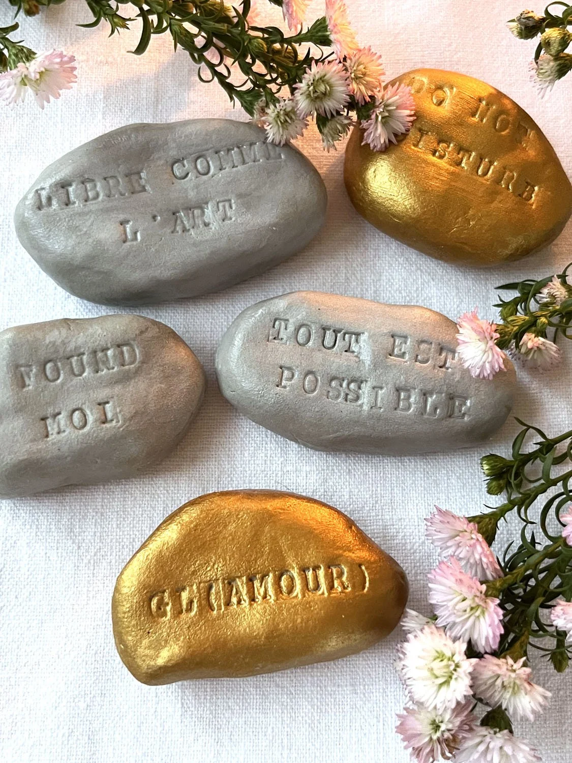 2- Imprimez vos messages sur chaque galet avec les tampons. Attention au sens des lettres. Faites des essais sur une chute de pâte afin de ne pas les imprimer à l’envers. Voici une liste non exhaustive de petits messages bienveillants à laquelle vous pourrez ajouter des mots simples tels que courage, passion, gratitude, etc. : “Libre comme l’art”, “Tu peux y arriver”, “Tout est possible”, “Une seule vie”, “Ta vie commence aujourd’hui”, “La belle aventure d’être soi”, “Enjoy to be you”...