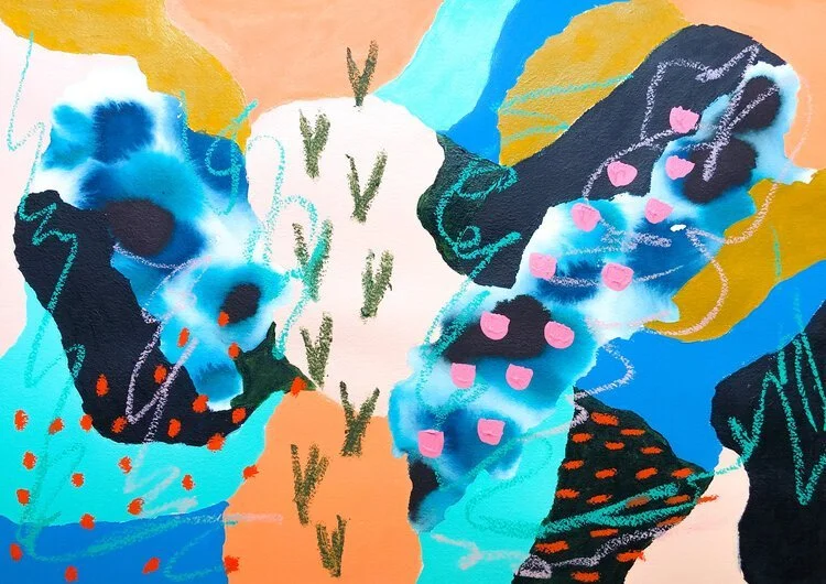 Si elle touche aussi à l’illustration et la bande dessinée depuis ses années lycée, l’art abstrait occupe cependant une place privilégiée dans le cœur de cette amoureuse de la gouache et de l’aquarelle. Ses peintures sont flamboyantes, enjouées et explosives à la fois, et ses coups de pinceaux remplis d’émotions. Son conseil : “Never give up and never stop. Consistency always.” (“Ne laisse jamais tomber, ne t’arrête pas, sois cohérent et constant.” selon ma propre traduction). Bien dit Katie.